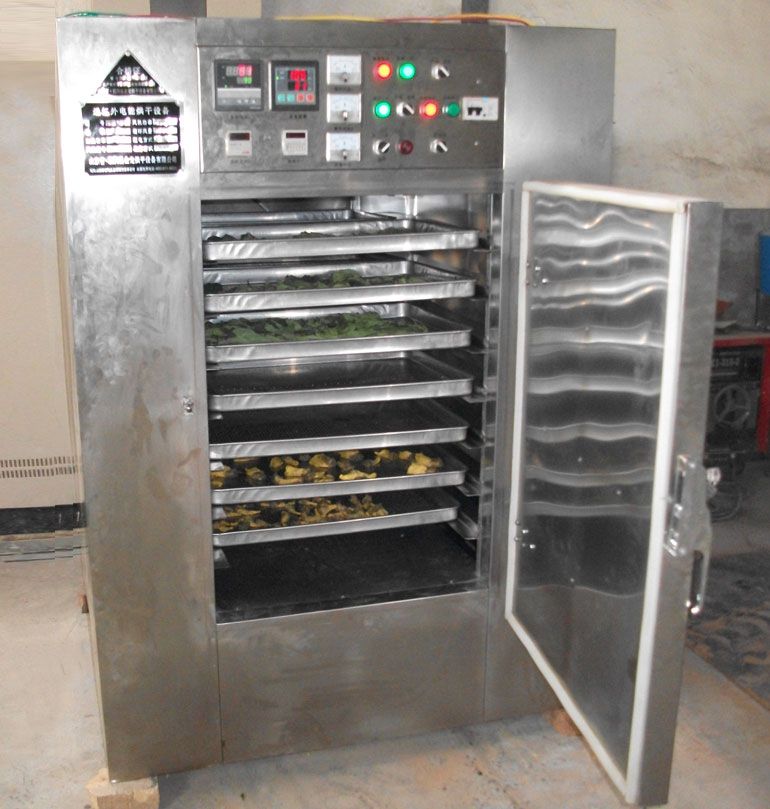 首先要建立烤房,可根據金銀花加工量確定烤房大小,可采用回籠炕式火道烘烤,也可直接放兩個爐子烘烤,在房頂留天窗,南墻上部安一排風扇,北墻離地面0.3米處設一對進氣孔。房內兩側各設擺放托盤的角鐵架或木烘架一個,層距要大于10厘米,以利于排濕。上花前先預烘,去除室內潮氣,提高溫度,當室內溫度上升至35℃時即可裝花,花厚度保持在2~3厘米,將托盤整齊地排放在烘干架上,關閉門窗,堵塞進氣孔,進行烘烤。為使室內上下受熱均勻,每個烤房內放置一個車間用的大型落地扇,不停扇風。裝好花后,要立即增加火勢,當室溫提高到40℃時(一般6小時),保持室溫在40℃~45℃,待花的水分大部分排除(如達不到八成干,需延長控溫40℃~45℃的時間)時封嚴進氣孔,把室溫提為55℃~60℃,金銀花即可迅速干燥。整個烘干過程一般需歷時18小時。出烤房前1小時左右陸續減火,打開進氣孔進行通風換氣。烘干金銀花時,應注意三個關鍵問題:一是層托盤一定要距離爐口1米以上,1.4米以上;二是一定要在排濕期間打開進氣孔、天窗和排風扇,使烤房內形成對流;三是要待金銀花八成干時再加溫,否則可能造成黑頭。