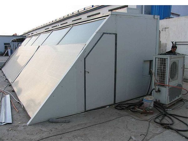 熱泵助推式太陽能烤房主要由太陽能空氣集熱器、空氣源高溫熱泵、智能化烤房系統三部分組成。通過太陽能空氣集熱器對空氣進行加熱,利用循環風機通過管道將高溫空氣傳輸到烤房在烤房內通過太陽能空氣集熱器對 空氣進行加熱,利用循環風機經過管道將高溫空氣傳輸到烤房內;通過溫、濕度感應器檢測,根據所測溫、濕度和干燥工藝,由智能化控制器控制空氣源熱泵的啟、停,排濕門的開、閉、實現全自動干燥。